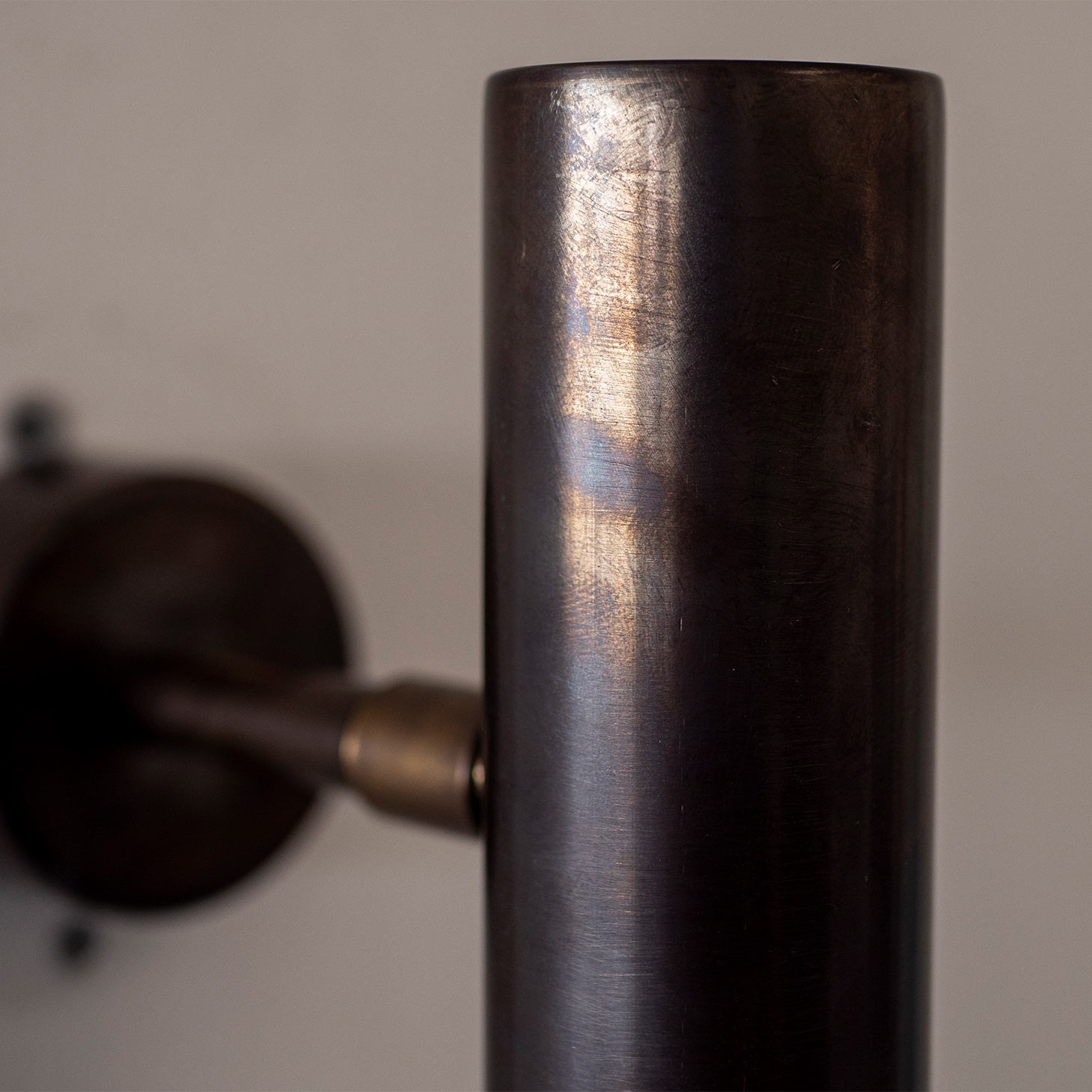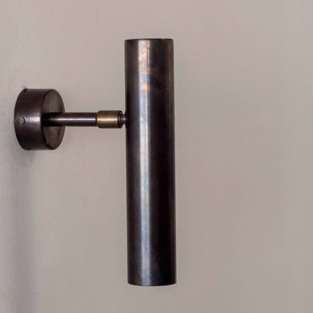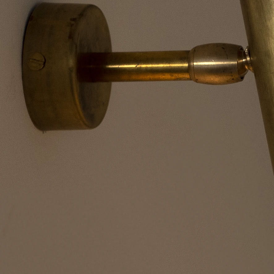 This swiveling and tilting wall lamp with a 20 cm long cylindrical shade is handmade in Italy from brass.