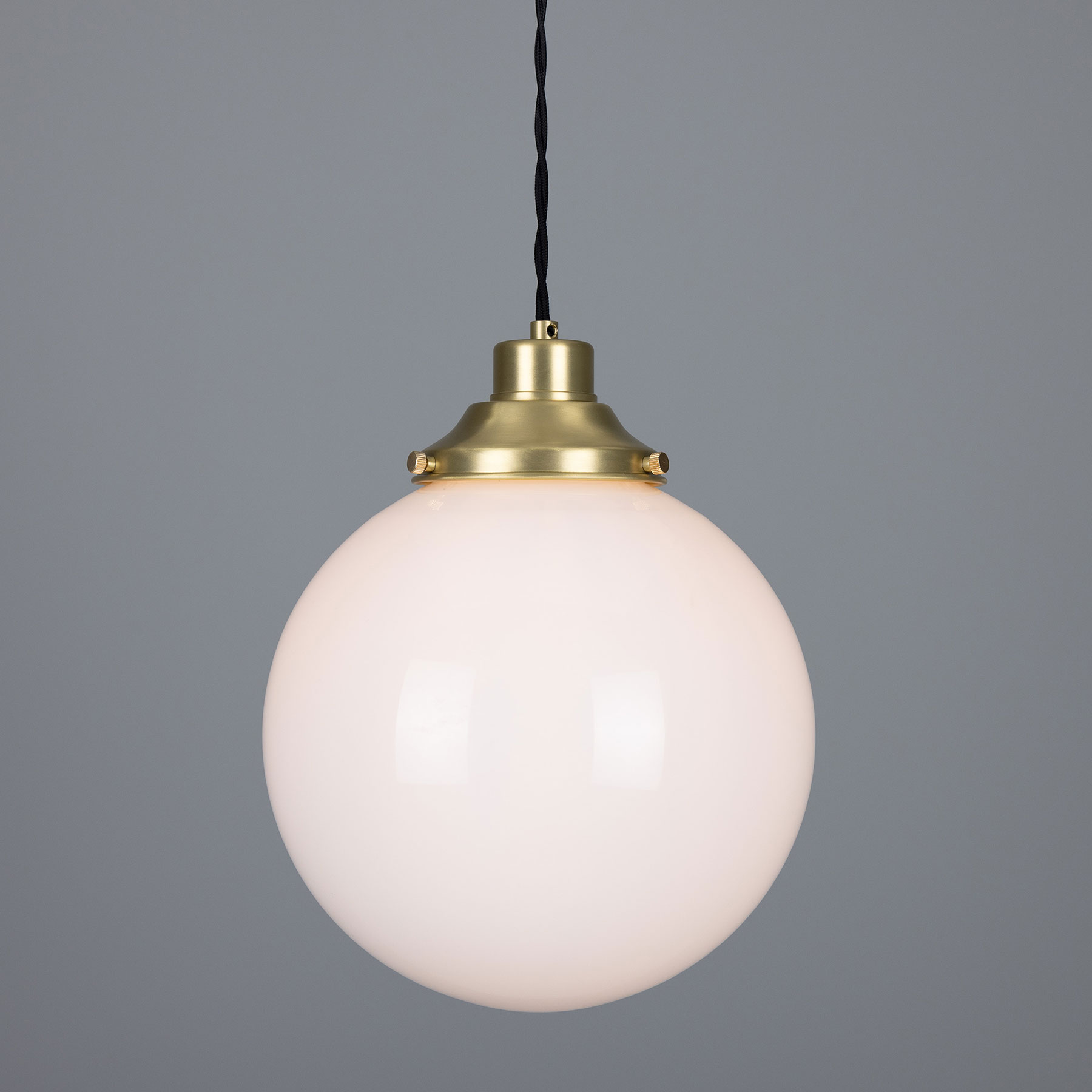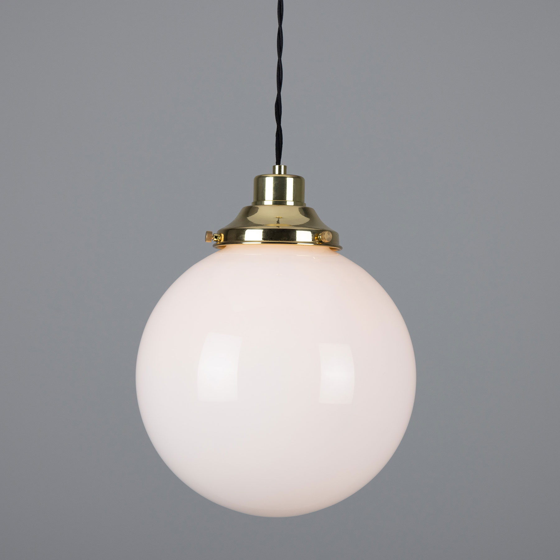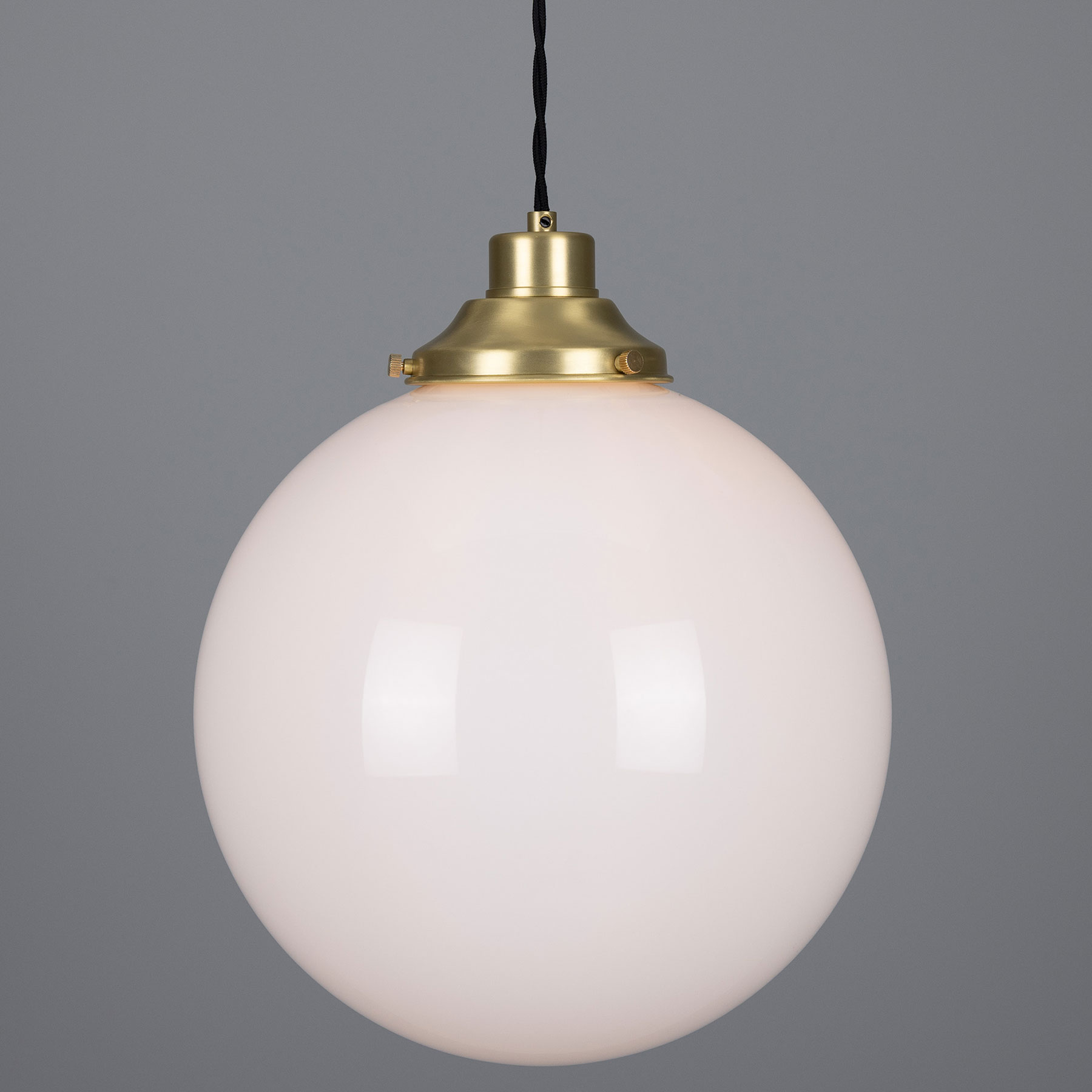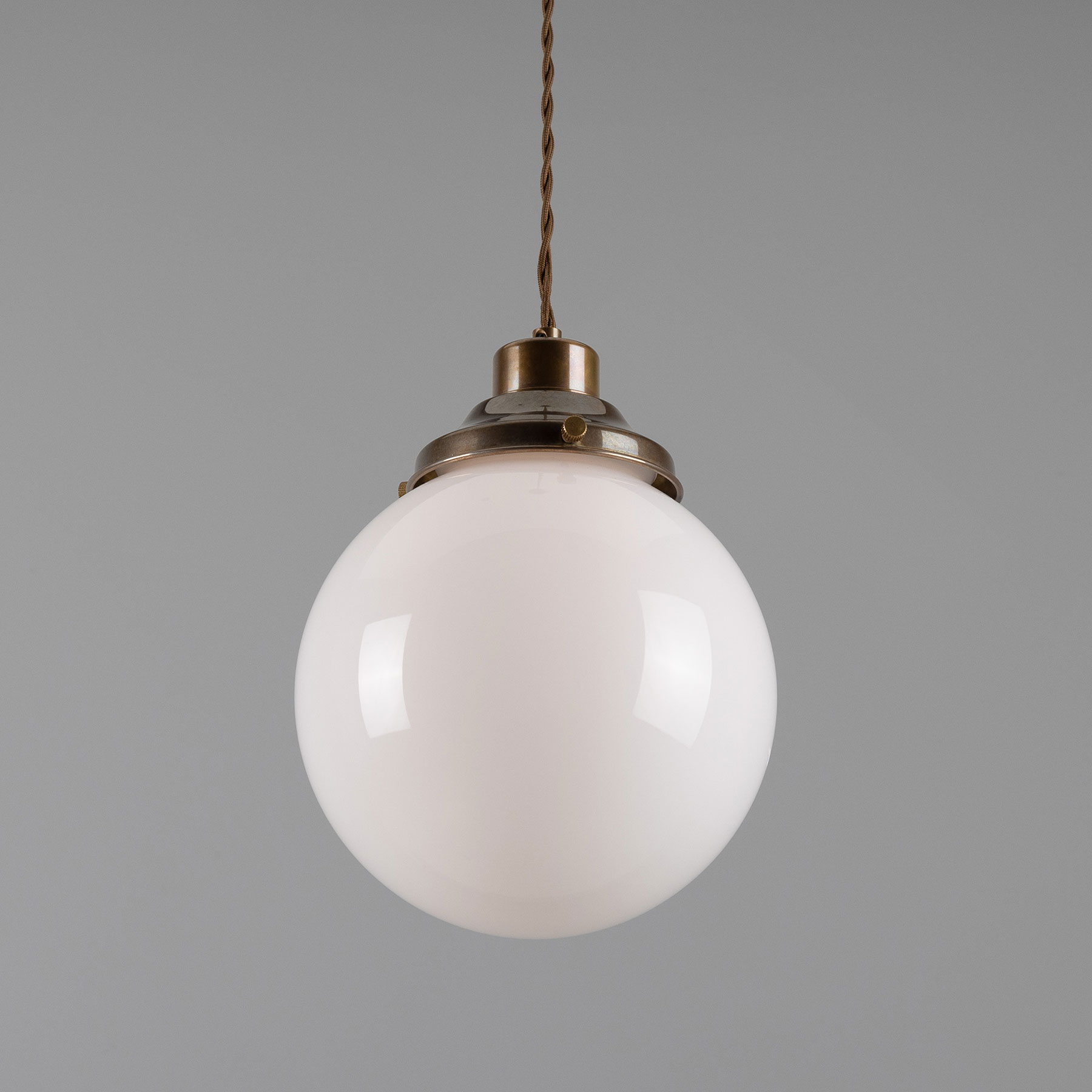 This spherical pendant light is manufactured in Ireland with an opal-white glass sphere (Ø 20, 25 or 30 cm) mounted on a traditional yet timelessly understated brass bracket.