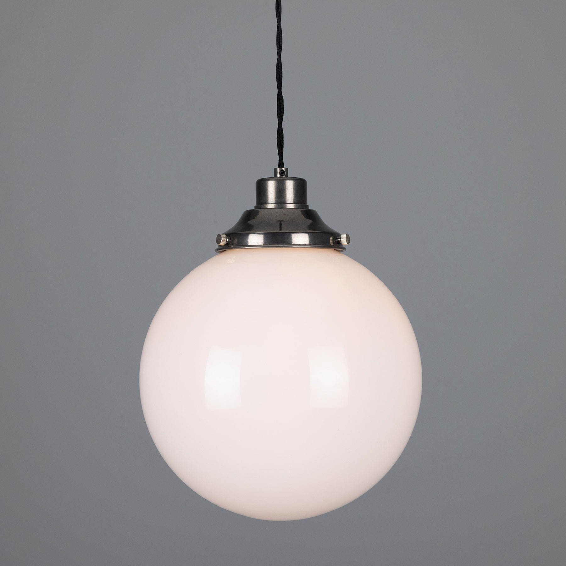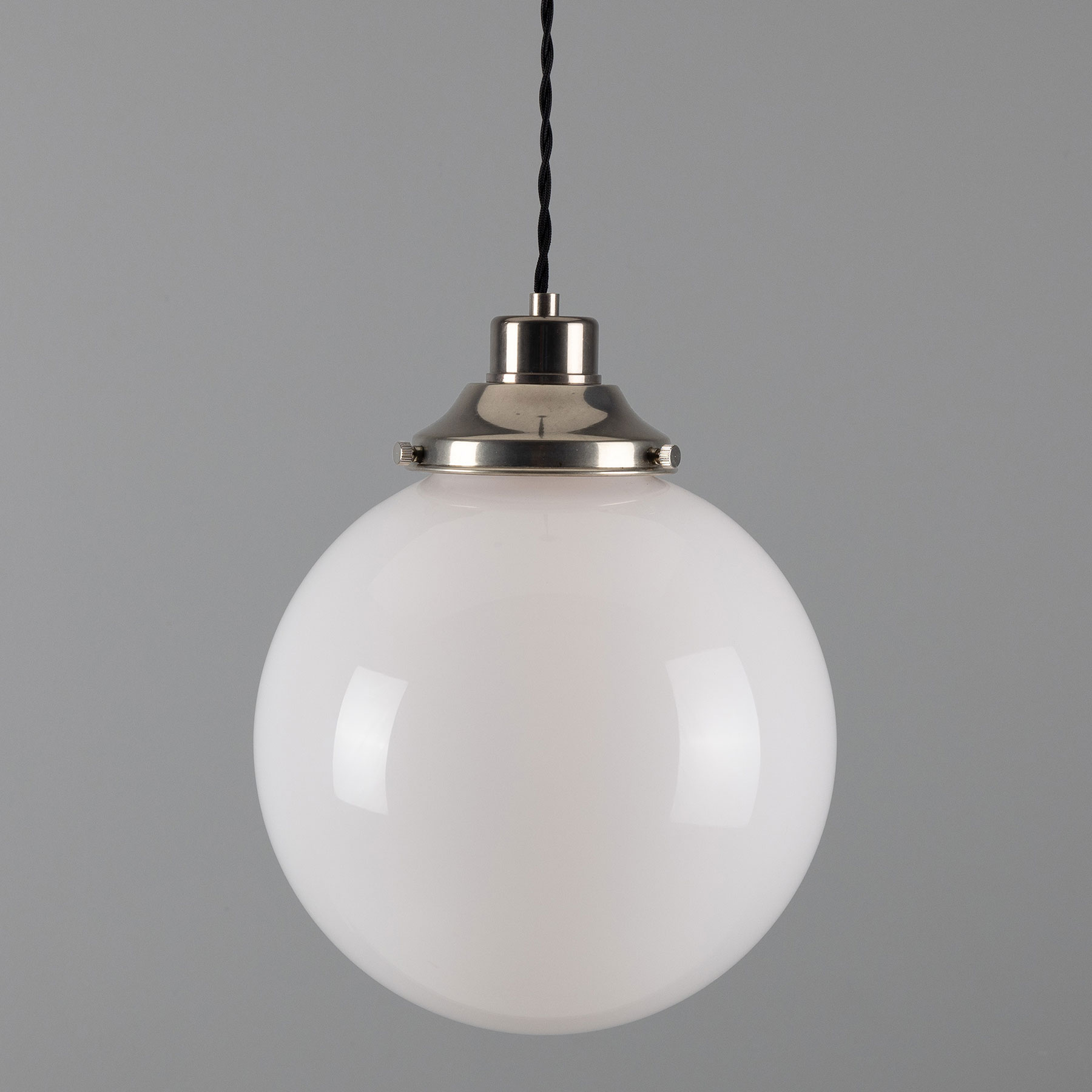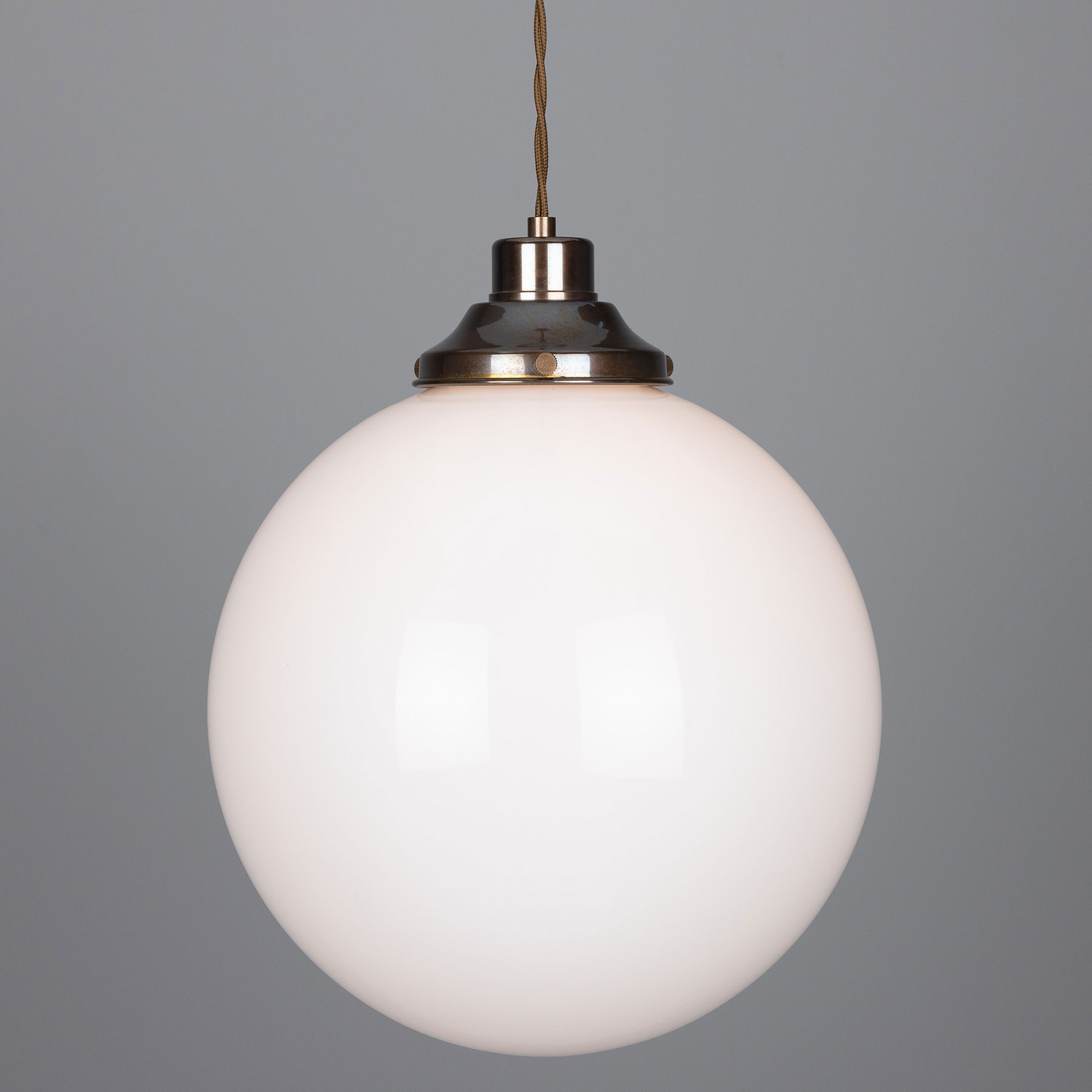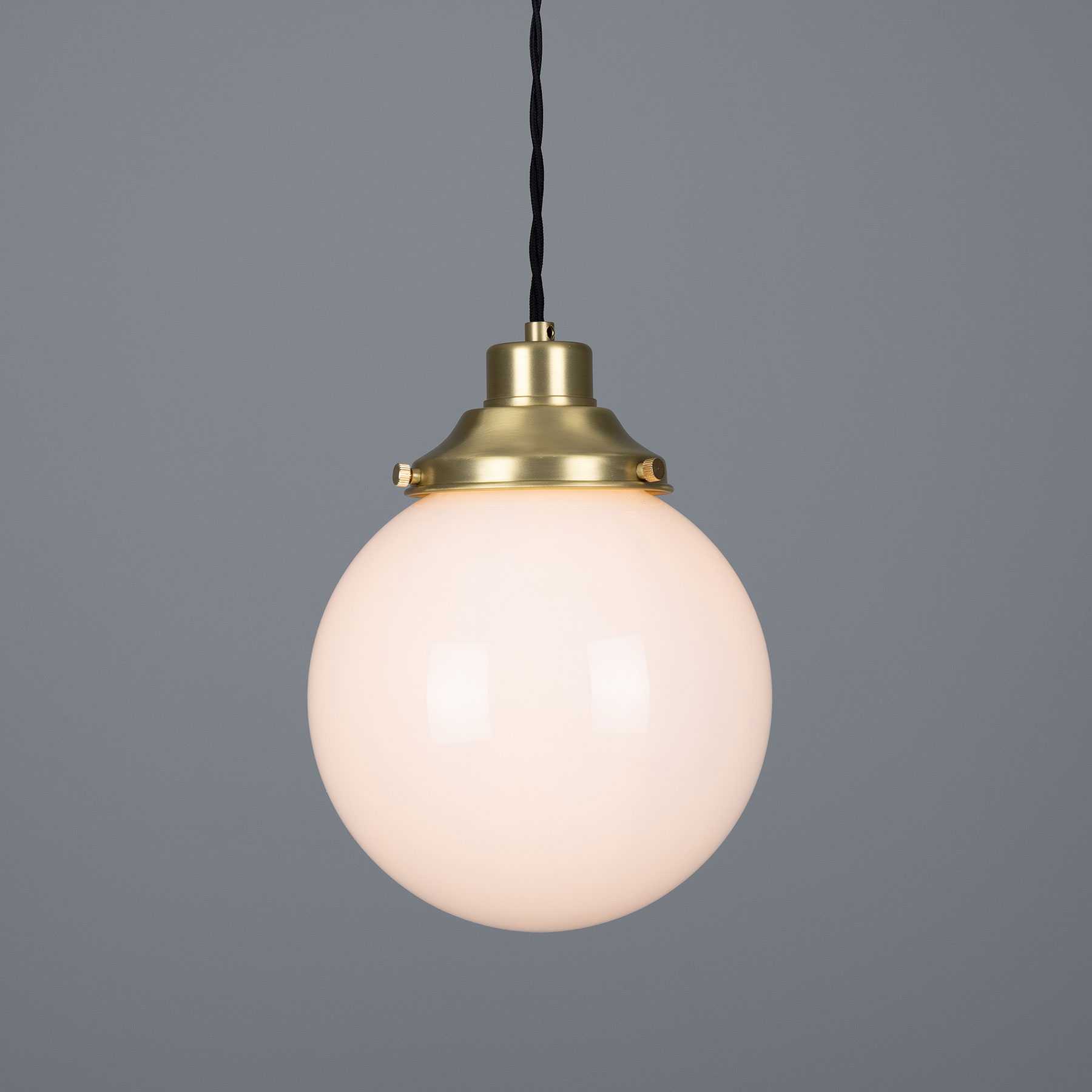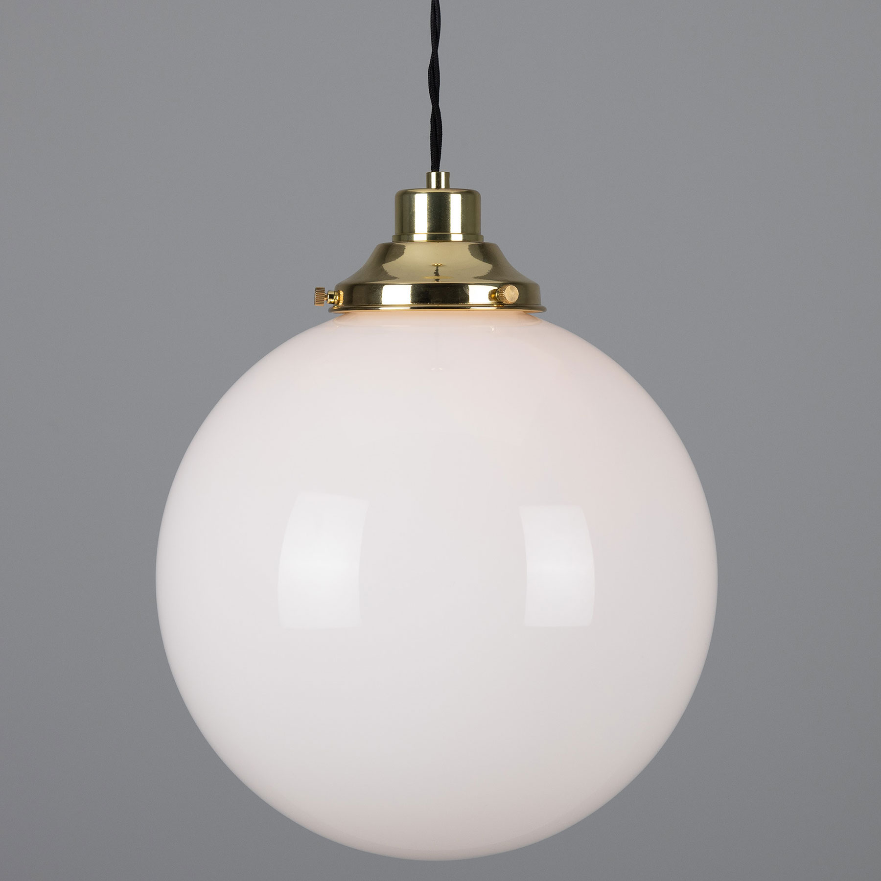 This spherical pendant light is manufactured in Ireland with an opal-white glass sphere (Ø 20, 25 or 30 cm) mounted on a traditional yet timelessly understated brass bracket.