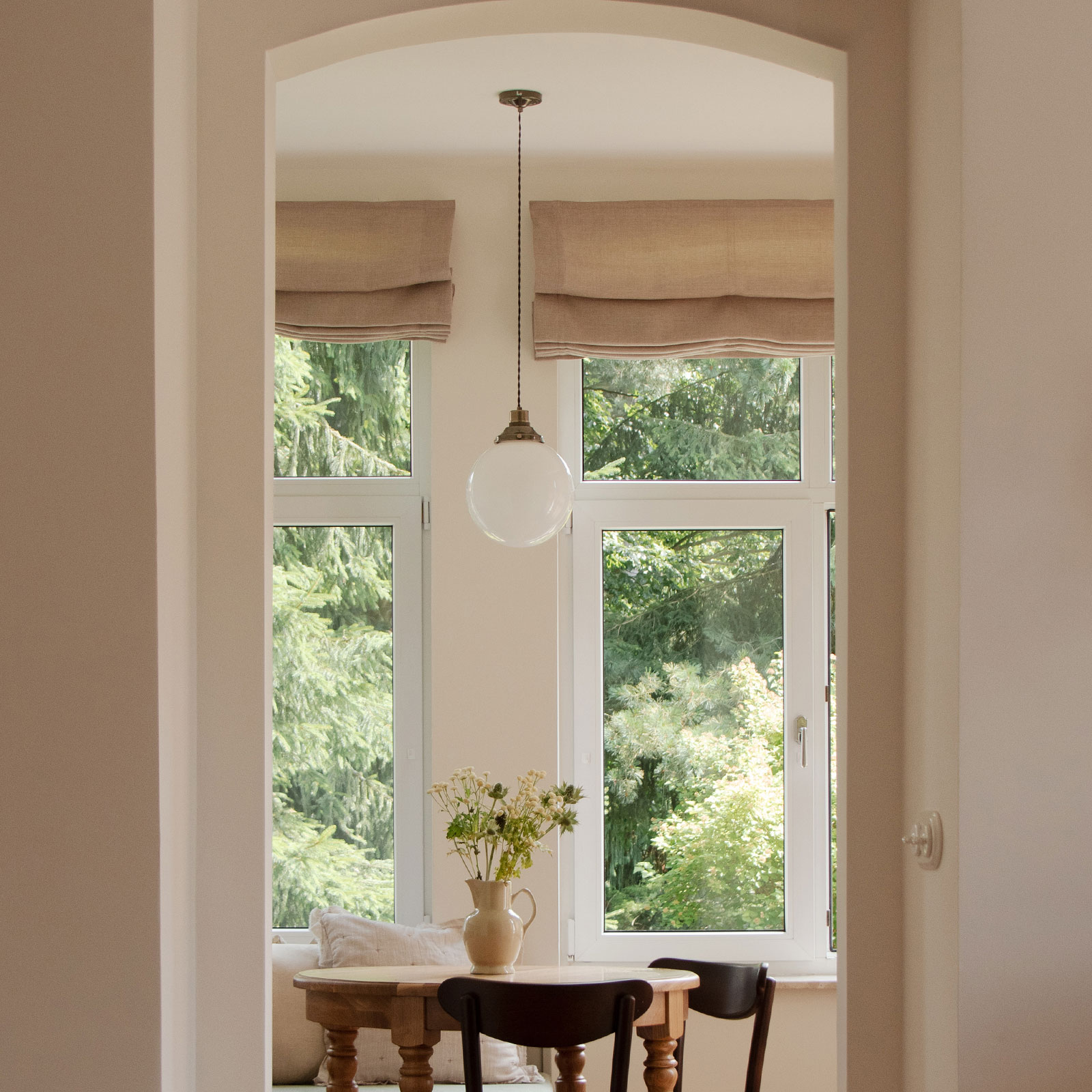 The brass components of the pendant light (glass holder, ceiling rose) are available in various brass finishes, allowing for a more nostalgic, rustic or timeless character to be emphasised: