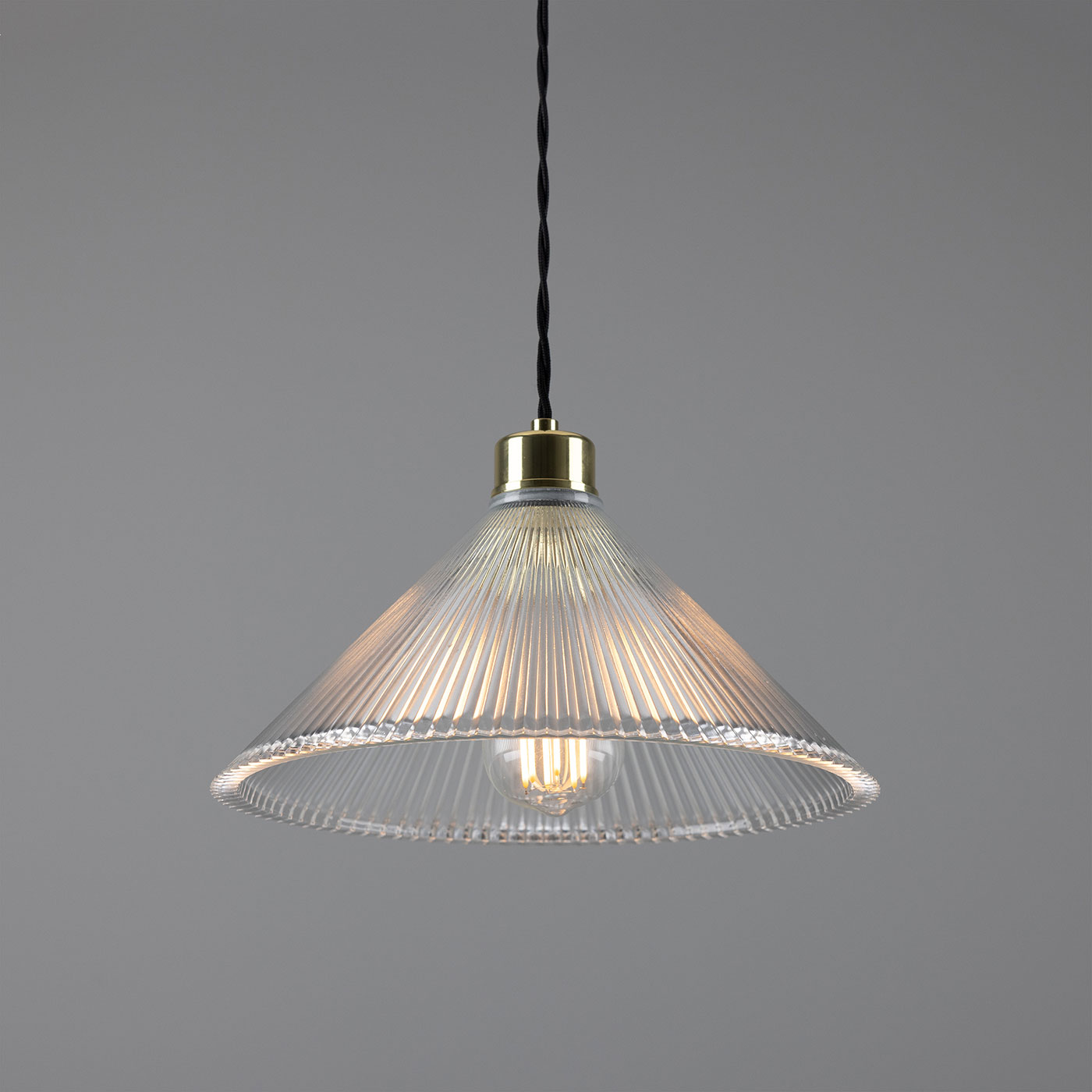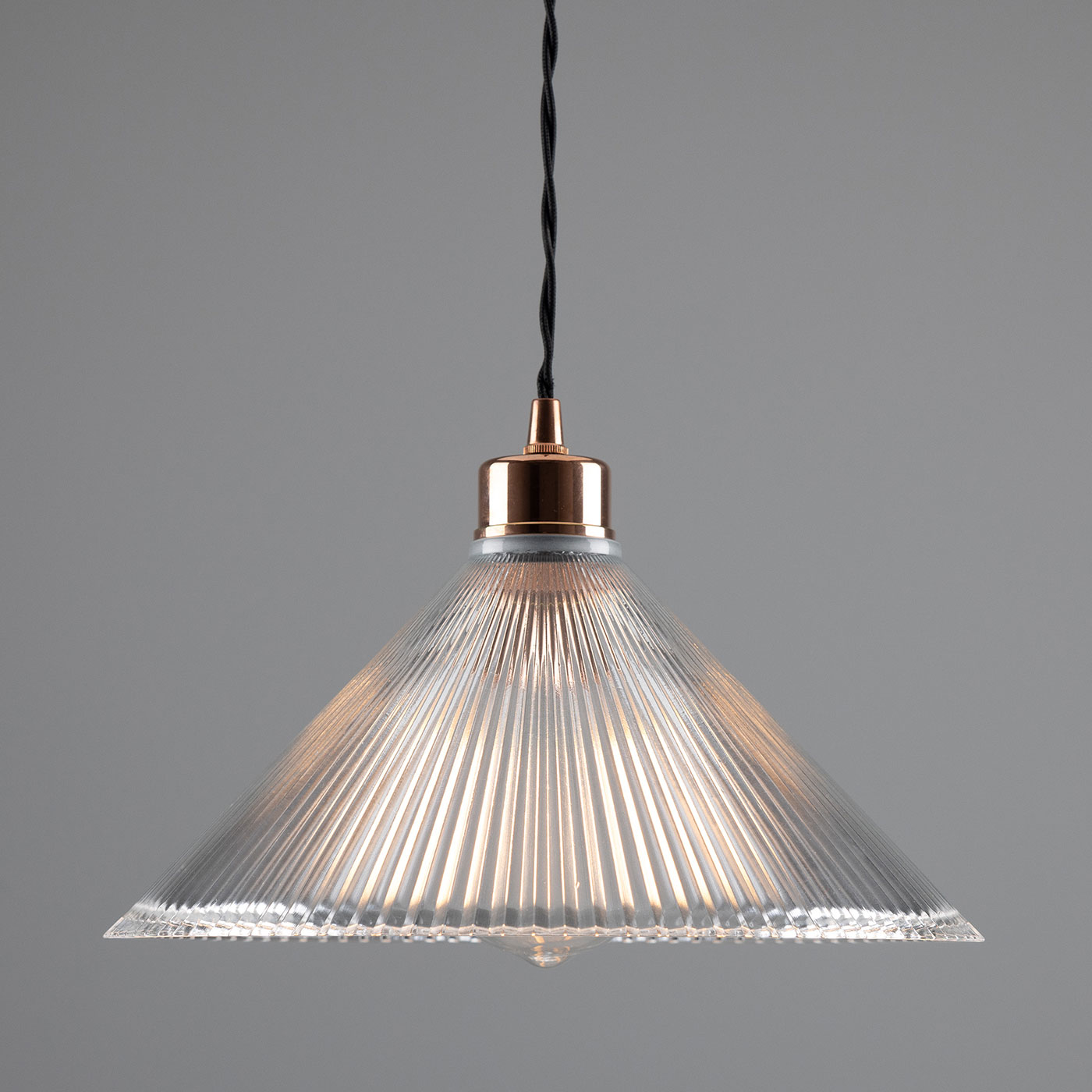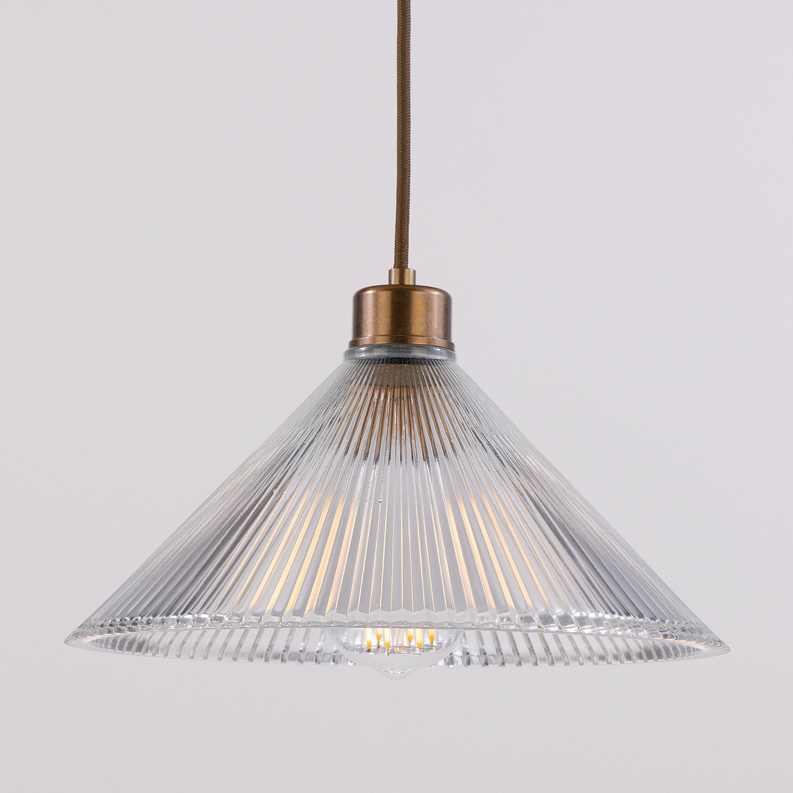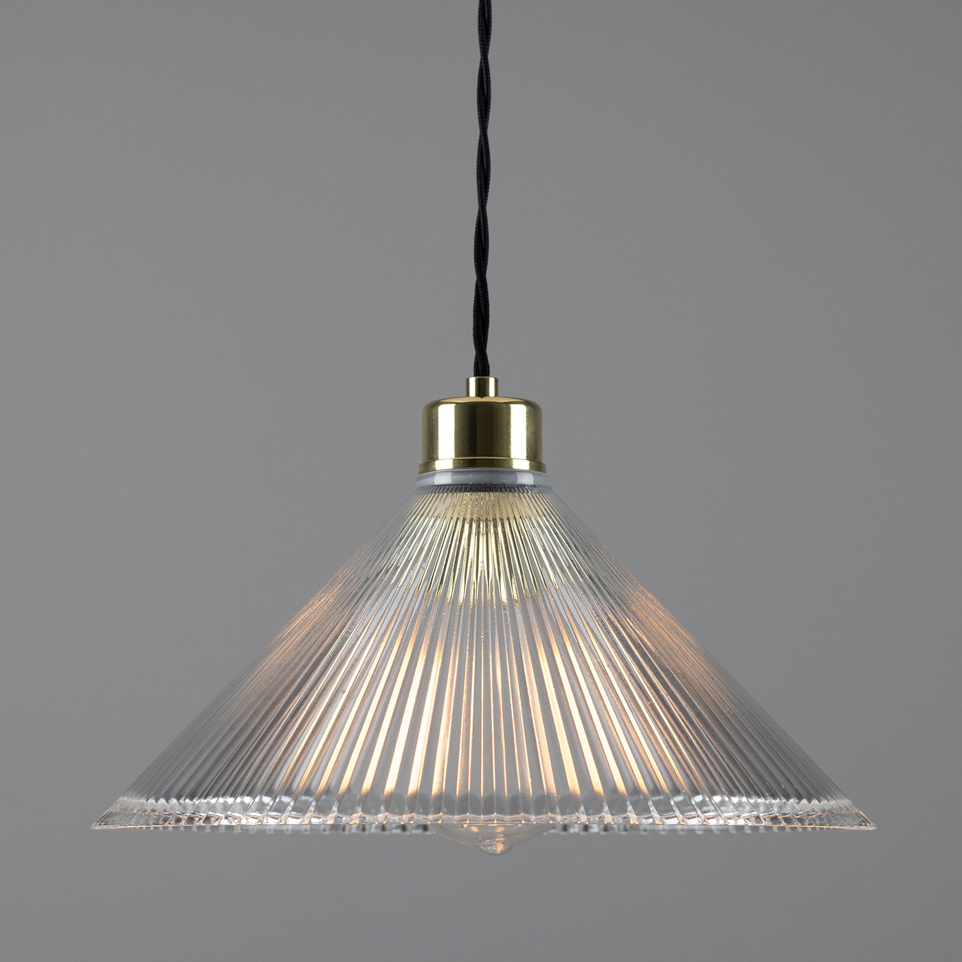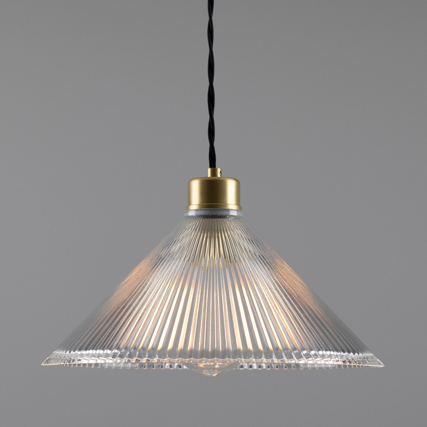 This pendant light, featuring a conical shade made of grooved ‘Holophan’ glass, is suitable for universal indoor use. It is handcrafted in an Irish workshop.
