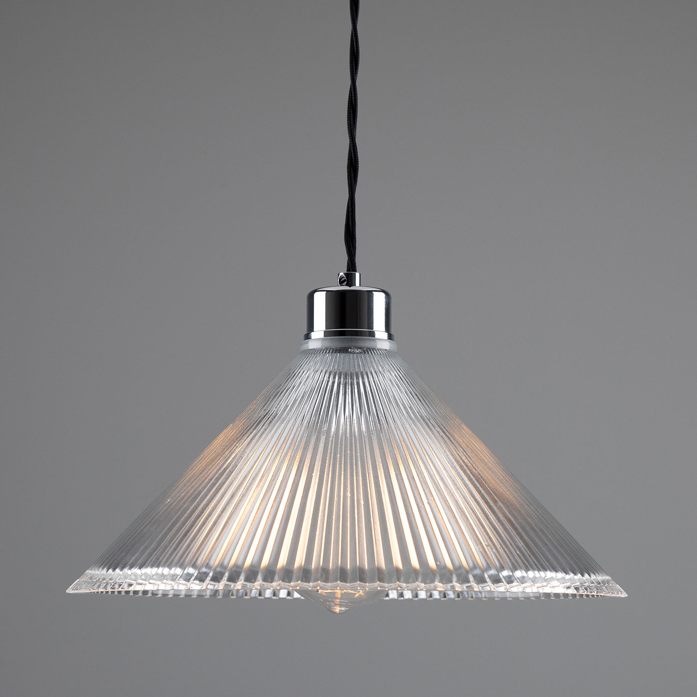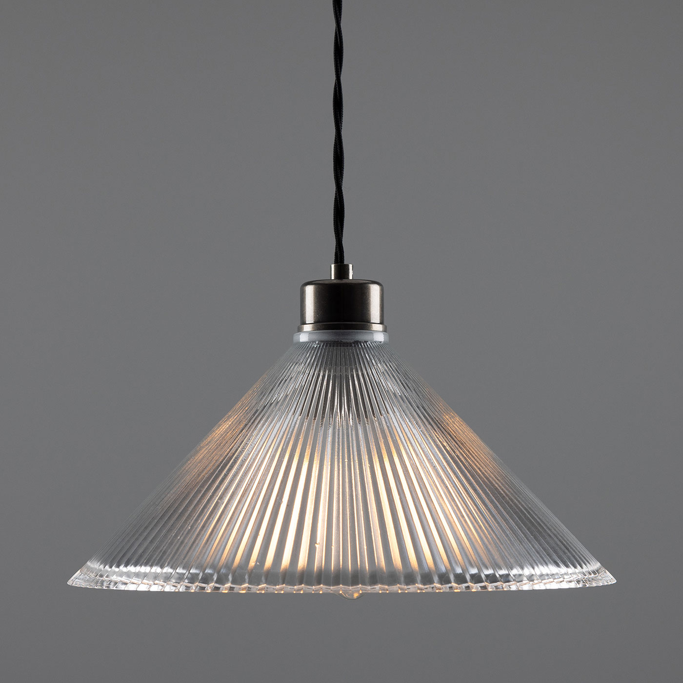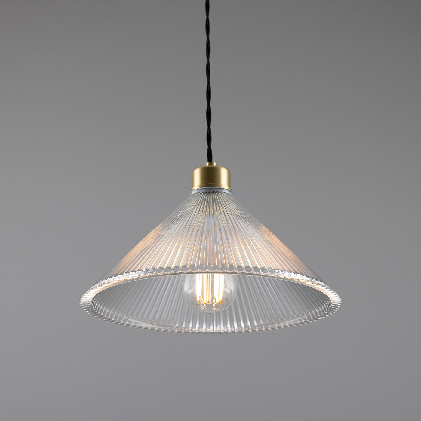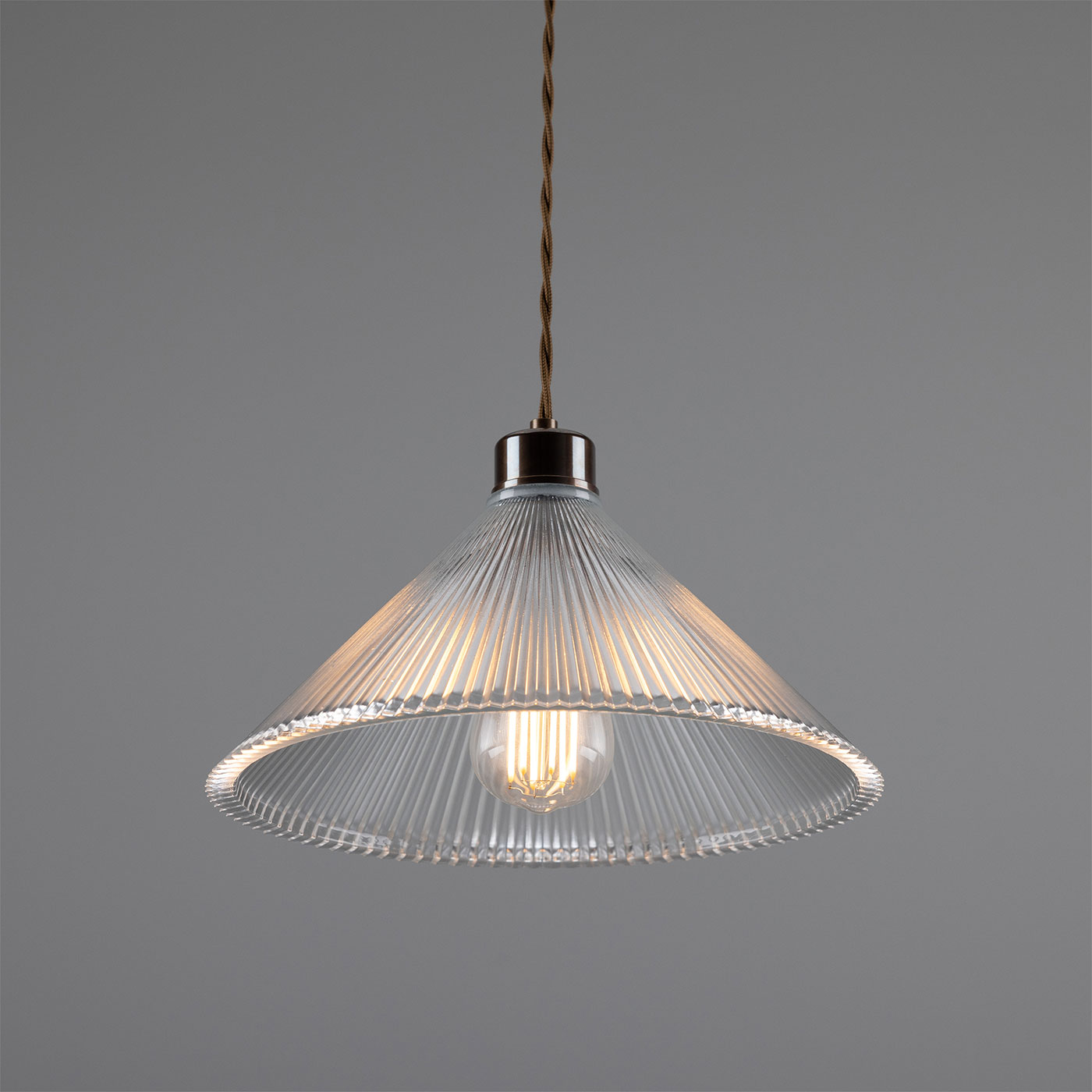 This pendant light, featuring a conical shade made of grooved ‘Holophan’ glass, is suitable for universal indoor use. It is handcrafted in an Irish workshop.