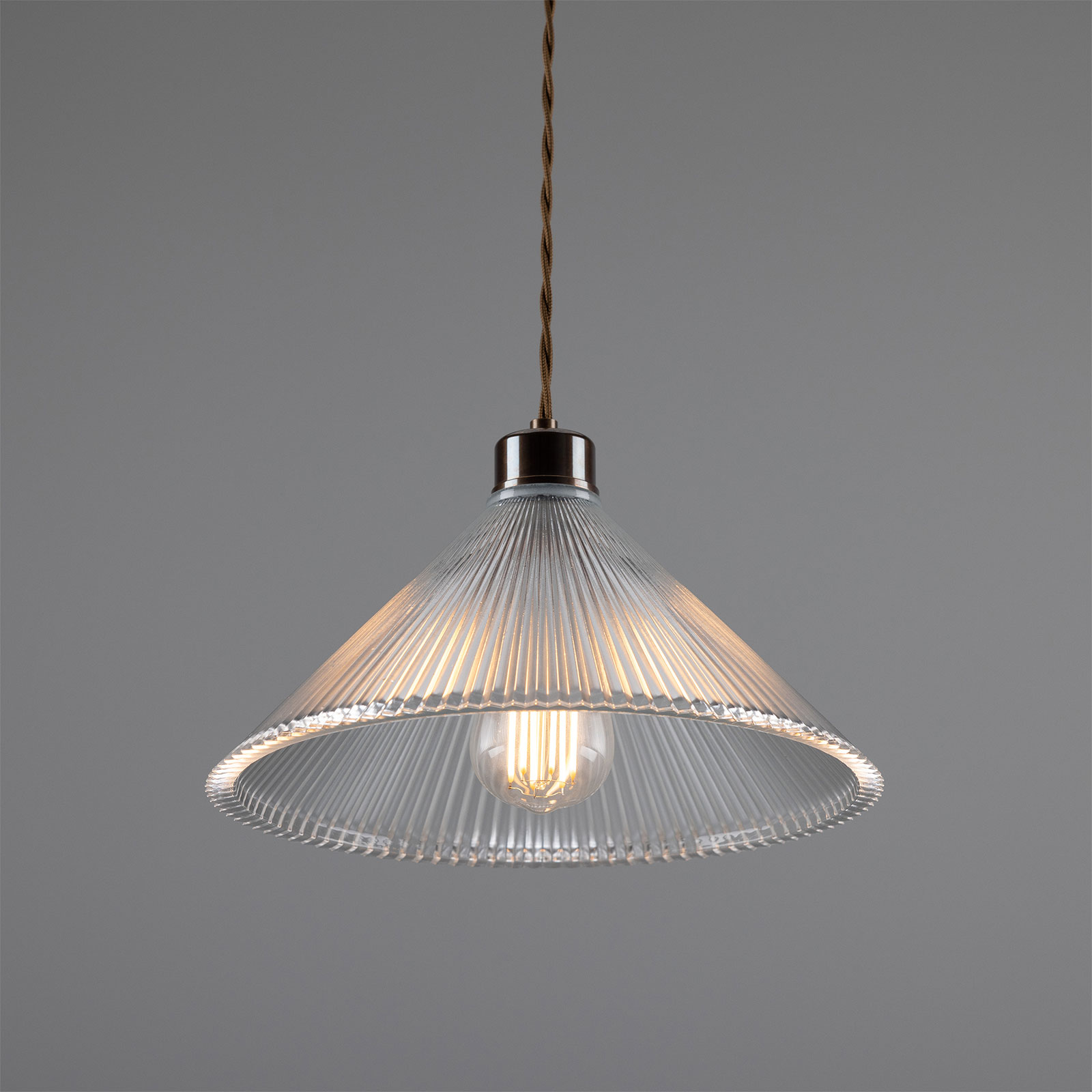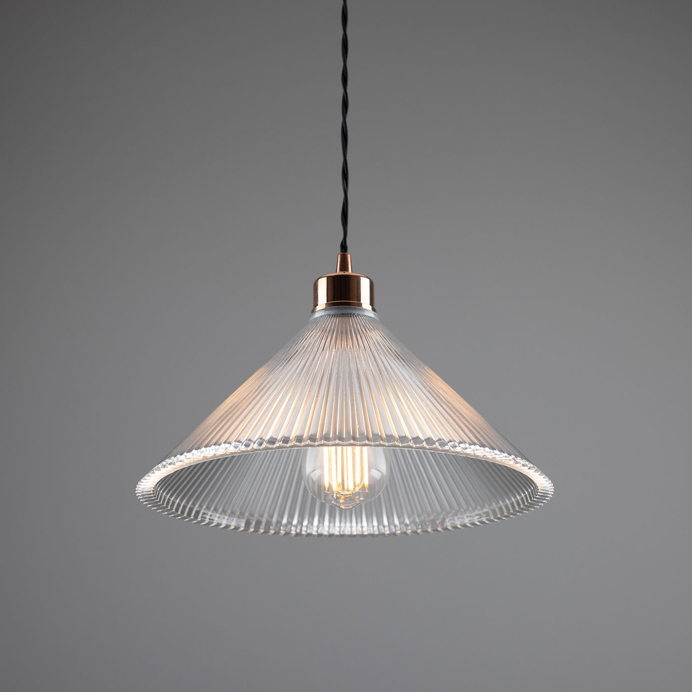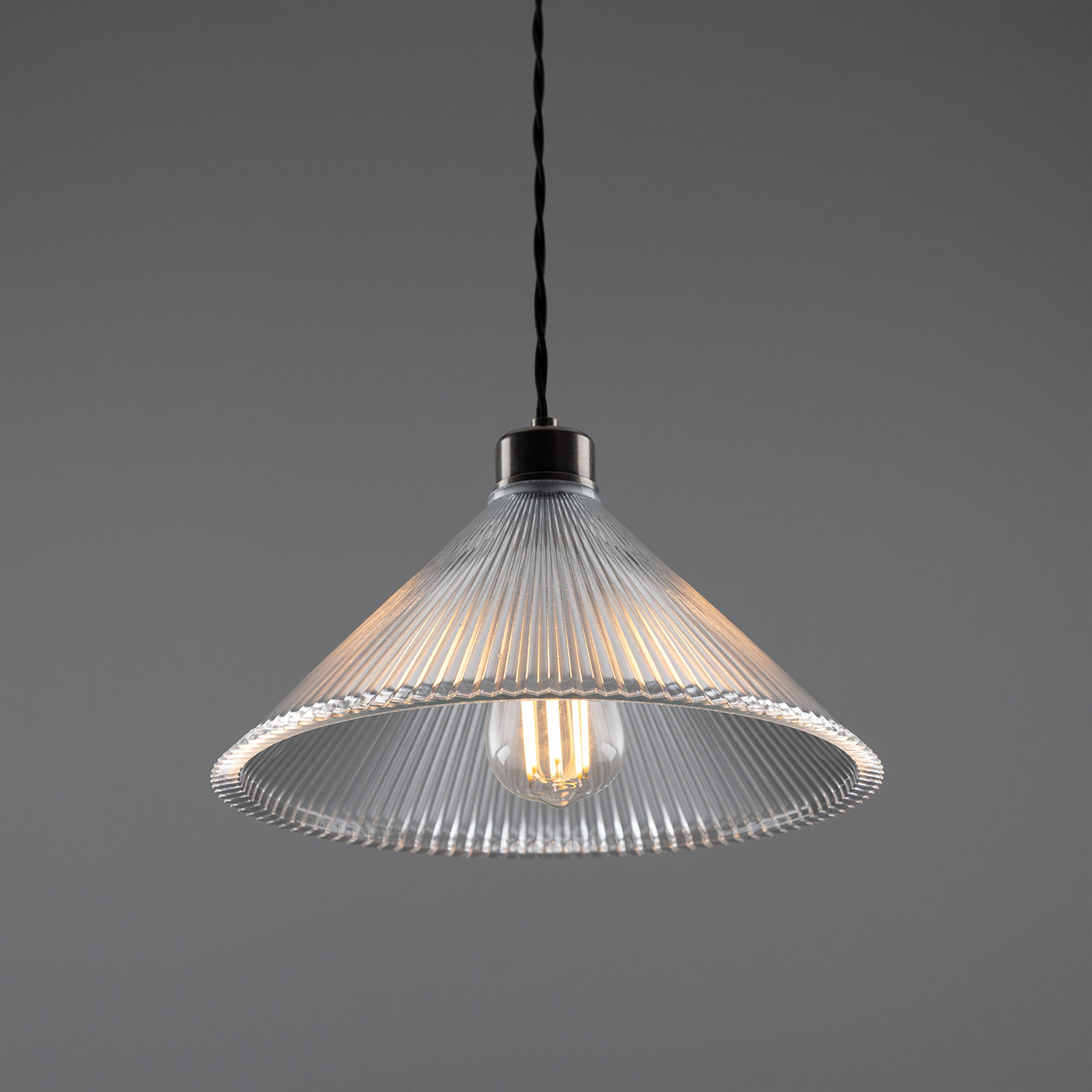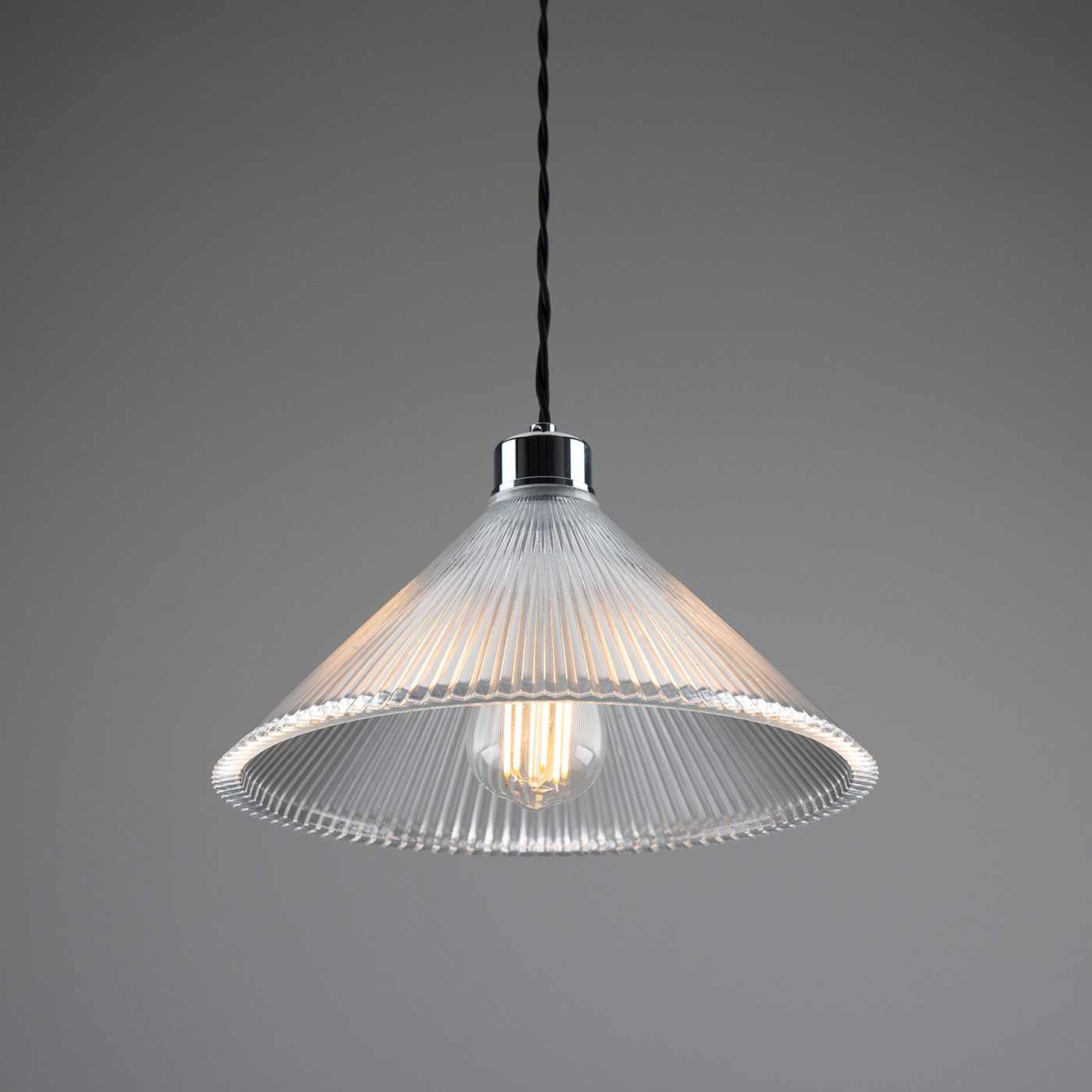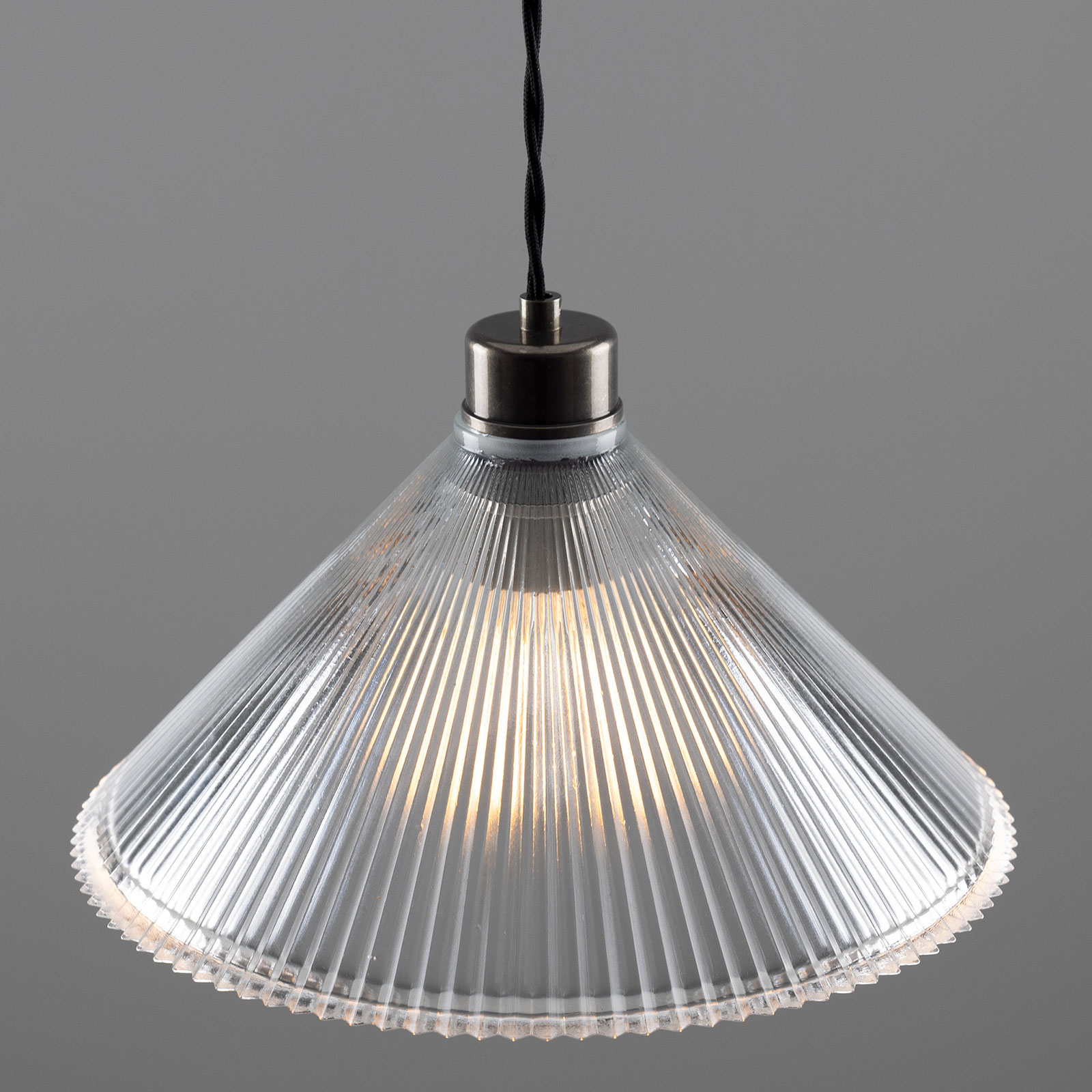 This pendant light, featuring a conical shade made of grooved ‘Holophan’ glass, is suitable for universal indoor use. It is handcrafted in an Irish workshop.